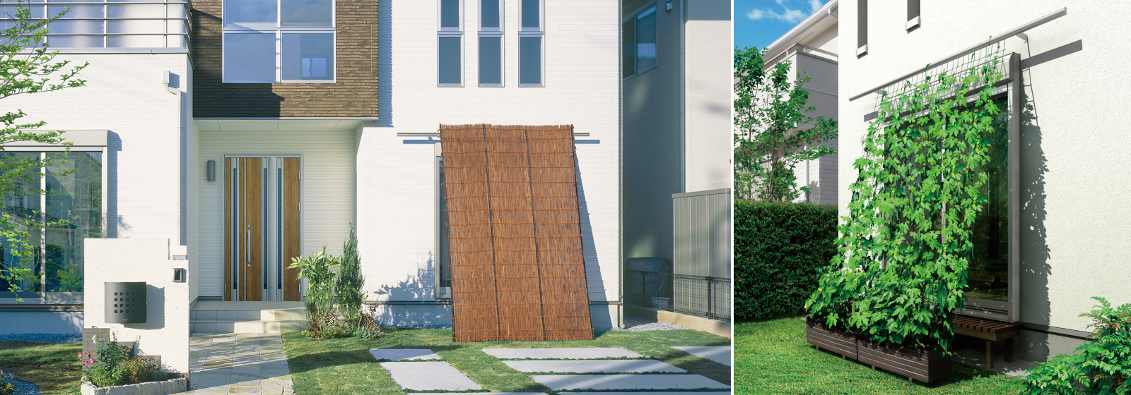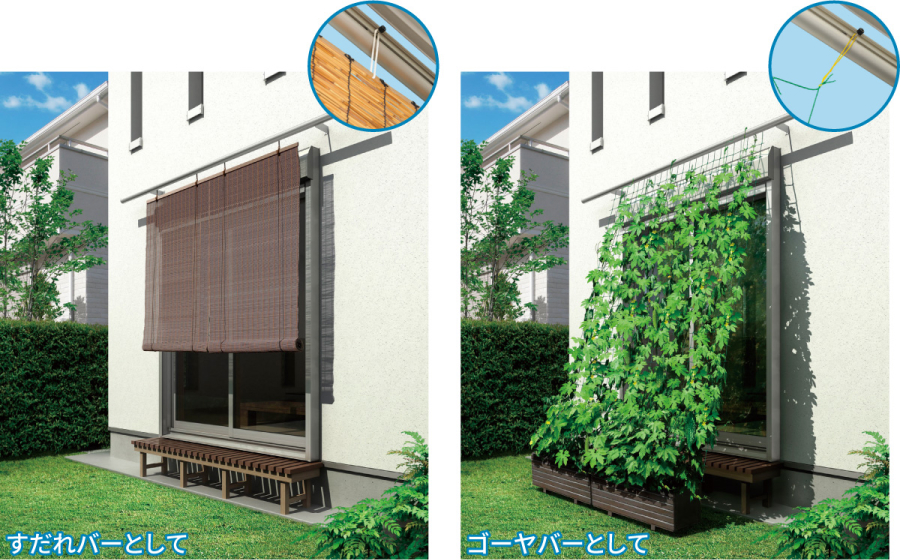 “よしず”や“すだれ”はもちろん、ゴーヤやへちま、朝顔などのつる植物を這わせてグリーンカーテンを作ることもできます。窓サイズに応じて長さ2,000mmと3,000mmから選べます。